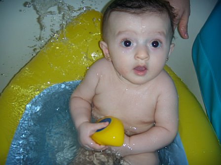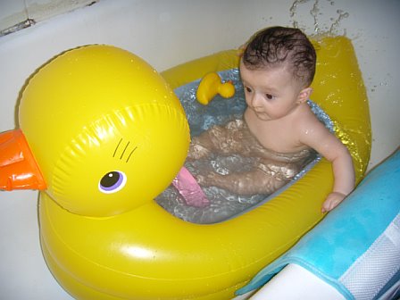 So my DD is a bit too big for the infant bathtub but too small for the regular adult tub, so I bought her this blow up rubber ducky that goes in our tub and she looooved it. The duck even quacks Please do not quote as I will be removing them in a bit.