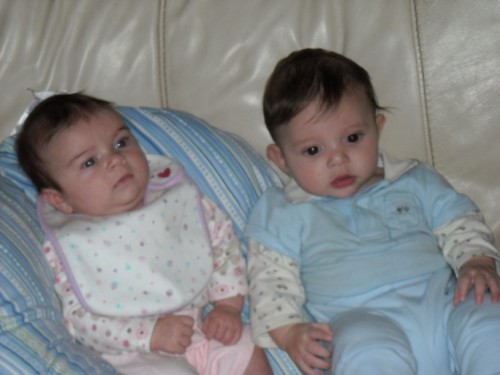 So Ryan got to hang out at Dina's house (1stimemom) and hang out with little Anthony and Sydnie (mikeswife06). Unfortunately, Anthony was snoozing during the photo op, but here are some pics of Ryan and Sydnie...