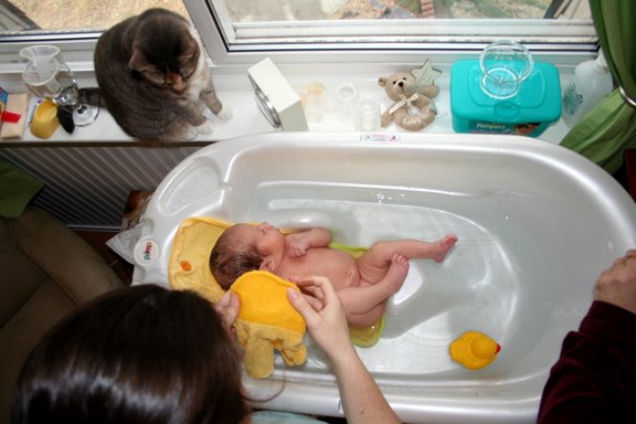 So exciting to be able to do her first bath. I remember how nervous we were! Love how your kitty had a ringside seat!