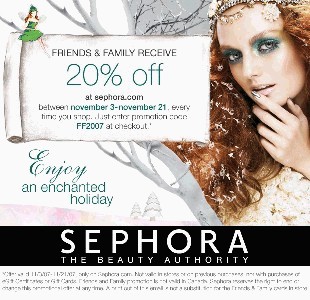 This year we are pleased to offer once again our Friends and Family discount online from November 3-21, 2007. Our Friends and Family can shop on sephora.com and receive a 20% discount at checkout by entering FF2007 in the promotion code box. Please forward this to your friends and family today! Image Attachment(s):