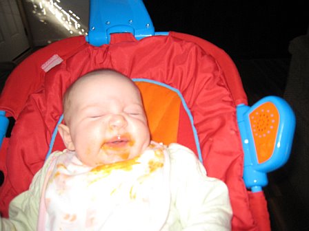 Now would be a good time to invest in some bibs that clean real well! I use the plastic bibs, everything wipes off, otherwise all her good bibs would be stained