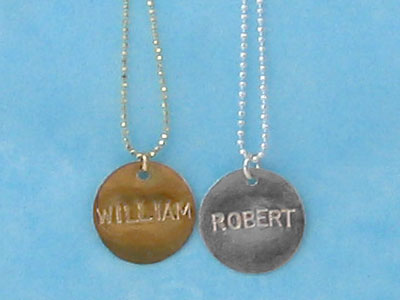 I don't have a pic, but I have a round silver disc for each of them. On the front is their first & middle names, on the back, birthdate. I wear them both on a silver box chain all the time. Picked a box chain b/c they are stong and Andy grabs for it all the time.