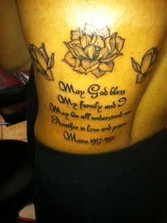 Memorial Tattoo.. A prayer my mom wrote in her diary and three lotus flowers representing my mom, sister & I. Image Attachment(s):