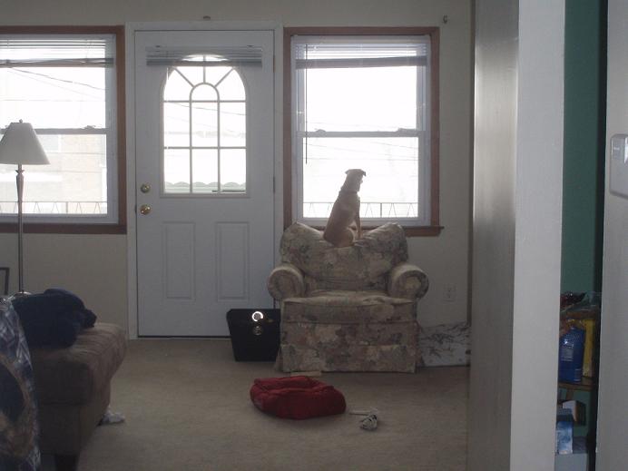Riker stares at the snow falling waiting for his chance to go out to play and eat it!