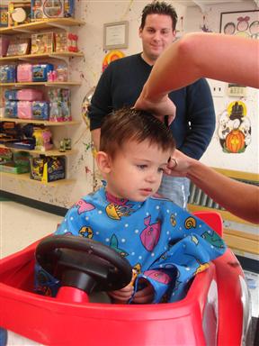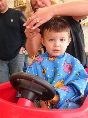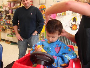 and brought him to Zippity Doos for his first "real" haircut. Yeah, he freaked out but he got to sit in a cool car, got a certificate and a little sample of his hair to take home. Most of these pics are before the buzzer came out. Image Attachment(s):