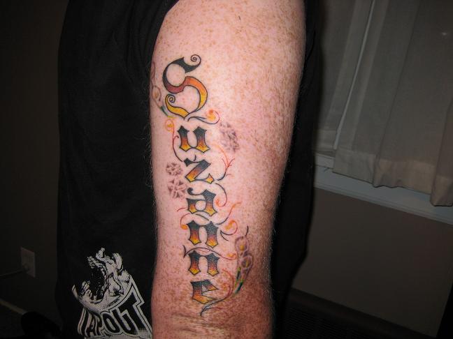I'm in shock!!! He told me he would NEVER tattoo anyone's name on him other then our DD's. When he showed me this I said, "I want a divorce!" (j/k) I still can't believe my name is permanently on his arm. BTW..he surrounded it with our wedding flower.