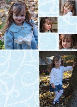 She is beautiful and has gotten so big. I love the order of the pictures but I think the one in the blue coat should be bigger. Also, I feel like the teal is competing with her blue coat. What about using a lighter verson of her coat as the background (which I really like by the way)?