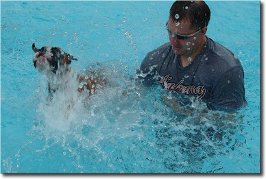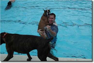 Last weekend we took Bama to doggy day at a local pool. The pool had closed for the season so they let the dogs from our dog park use it. It was fun, but I wish I had known beforehand that most Boxers aren't the greatest swimmers! When we got to the pool, Bama jumped in the water and sank like a rock. He finally surfaced (DH jumped in after him too), but wasn't able to do the doggy paddle. He kind of slapped at the water, trying to keep his head above the water. Poor little guy. Now we know to get him a vest for next time. You can see in the one picture that DH has to practically drag him into the pool!