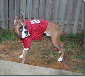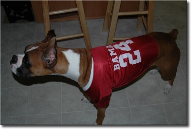 I also got him a Bama jersey to wear since college football season has started and DH is a HUUUUUGE Bama fan. It was a birthday gift for him. Thanks to Leeners for the info on doggy football jerseys! Image Attachment(s):