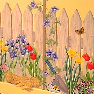 Also if you really want to handpaint it I think the easiest way would be to make a template or two out of poster paper or something heavy that you can just paint in the main shape of the fence posts -- and then use tape to make the horizontal pieces -- then once that's dry go back in and by hand add accents like nails and color variations.