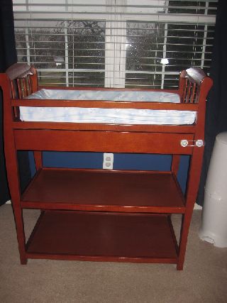 free standing changing table in a maple color.
