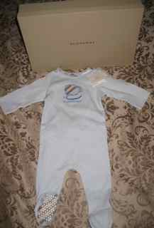 For Sale: NWT Burberry Lamb Footie, Blue Round neckline. Long sleeves. Lamb and logo embroidery on chest. Check print soles. Snap back. Cotton; lining, cotton/elastomer. Size - 3 months