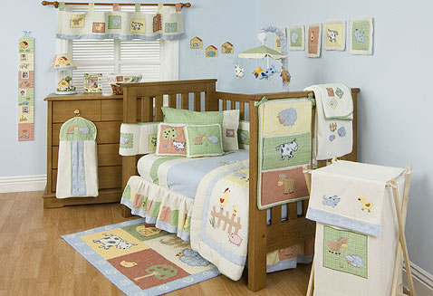 Kidsline Barnyard Bedding $75 Includes: Bumper, quilt, valance (1), wall hangings, rug, lamp shade, diaper bag, nightlight, mobile, Fleece Blankets (2), light switch