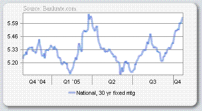 We locked in on Tuesday because everything I've found has indicated the rates will go up due to inflation from the hurricanes and the rise in fuel prices. To try to get a feel for what a disaster does to things, I went back and asked people their rates when they bought around septermber 11 cause that effected everyone and went right into the winter. It looks like between right after Sept 11 and the next February (so in 5 months) it went from about 6% to over 8%. At some point later it eventually creeped back down, but I don't think that's going to help anyone in the next couple of months (especially when I've been reading to expect a rise for the next 2 years). It's very stressful. I was getting and ulcer looking everyday and watching it go up. My bank (which is a large financial institution and I have no broker) went from 5.5% to 6.1% in the last 3 weeks or so.