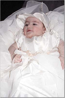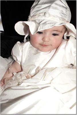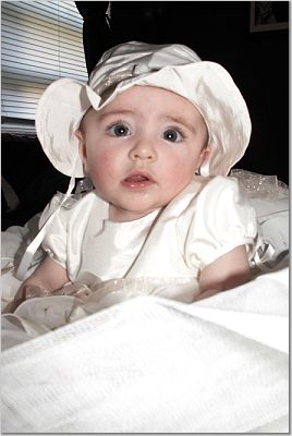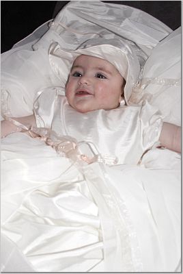 Very pretty! Why not dress her when you get to the church? That's what we did, so we could get him into his carseat and keep the gown fresh. We did the same. I could not get DS in his seat with the gown on. It took us 5 minutes literally to get him dressed and ready for the ceremony. We of course changed him back into his other outfit to go to the lunch after also. That dress is beautiful & your DD is gorgeous.