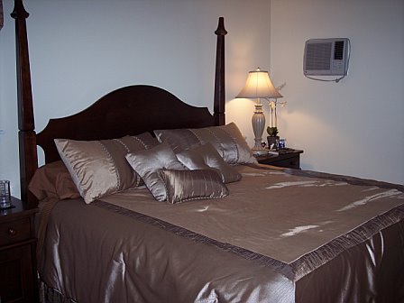 So my Master bedroom is dark cherry wood with beige walls and oak floors with a dark oriental rug. I have no idea what to put over my headboard - if anything. I feel like it looks plain. Any thoughts? I also wish I could cover the AC unti in the wall. I attached pics of the bed and my dresser with the pic I have over it. TIA