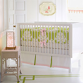 That crib is gorgeous and I think the green bedding would look fabulous!