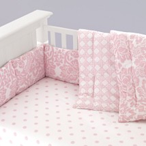 I think they are both beautiful and I was considering the pink myself. I do love the green though and I think it would look lovely with the dark. I do agree with the PP who said with the particular crib, you will not see the crib skirt. You might just see a small slice and if that is the case, you won't see the pretty green contrast. Does the pink one come in green? It looks similar to another set I was looking at-PBK Rose-and that came in green too.