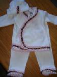 anyway its a white cotton kimono 2 piece pants set, with pink ruffled trim with brown leopard in the middle of the ruffles..on the top, and on the legs on the pants, and on the hat... i wish i could post it :( Image Attachment(s):