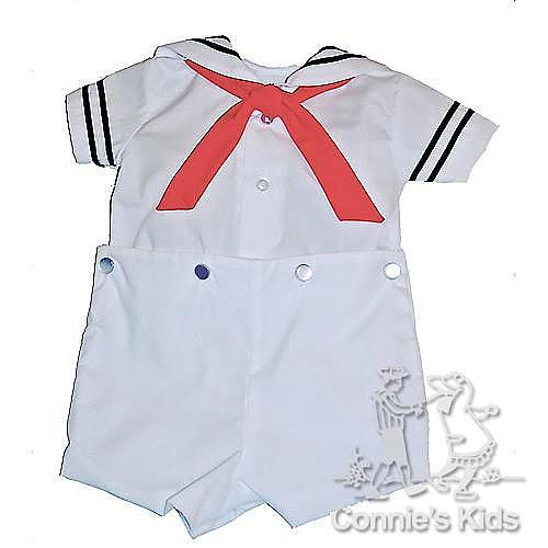 here's an idea.... what about asking your parents if they still have old christening outfits (yours, your husband's, or your siblings').... it would be a nice traditional touch (as long as they fit!)... and then you only need to buy the sailor suits....