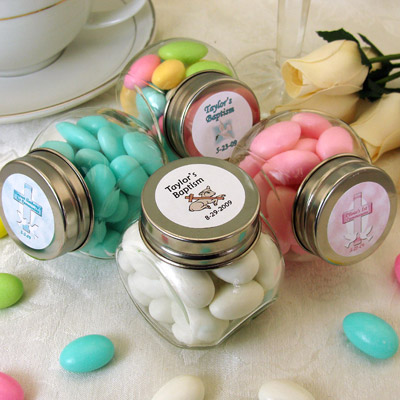 For my daughter's baptism, we did candy bar wrappers. It was basically a Hershey bar with a wrapper that said: Thank you for attending ______'s Baptism, Date, Godparents, etc. For my son's baptism, we did Hershey kisses with stickers on the bottoms and miniature hershey's with thank you wrappers as well. We put them in little cellophane bags and tied with ribbon. It was very cute. I bought the wrappers off ebay.