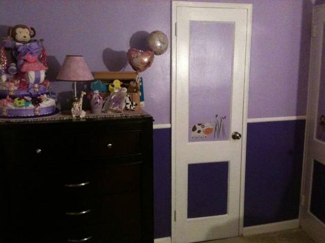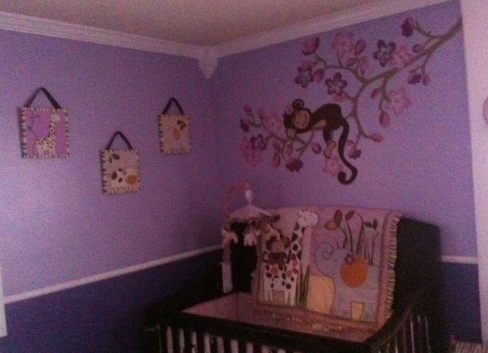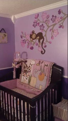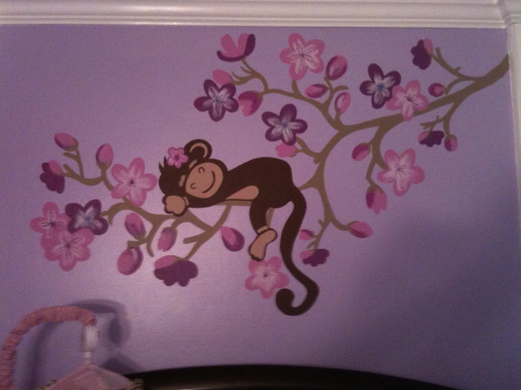 sorry for the poor quality cam phone pics i'll add my regular camera ones to an album once i upload themm.. but we have been making lots of progress in our LO's nursery !! My sister painted a monkey sleeping on a tree branch behind our crib & finished it last night.. i am IN LOVE with it!! we set up the room & had our parents over yesterday for the big reveal