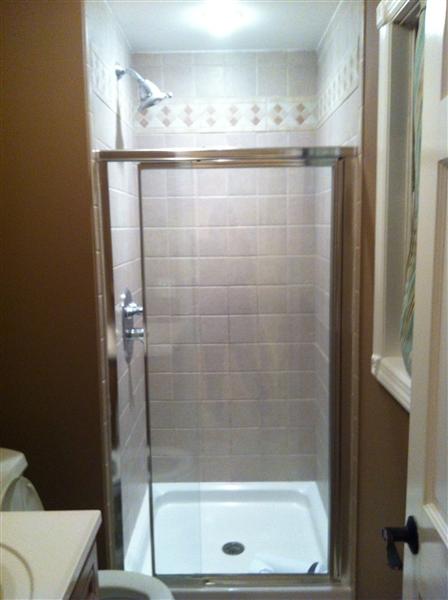 Here is the shower. The trim you see is the trim to the door. We didn't have room for an actual door so it's a pocket door.