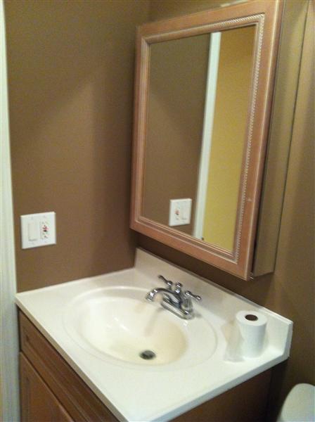 Another shot from the door. This is the vanity directly above the rectangle in the picture above. We use the small space closest to the door for linen storage and the other side for the trash can. There is no linen closet, but the vanity has a lot of storage. No medicine cabinets, we keep our meds in other rooms.